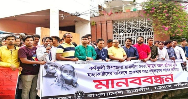 কর্ণফুলী উপজেলা ছাত্রলীগ নেতা মামুন আল রশীদের হত্যাকারীদের দ্রুত গ্রেপ্তার করে দৃষ্টান্তমূলক শাস্তির দাবিতে মানববন্ধন করেছে চট্টগ্রাম দক্ষিণ জেলা ছাত্রলীগ।