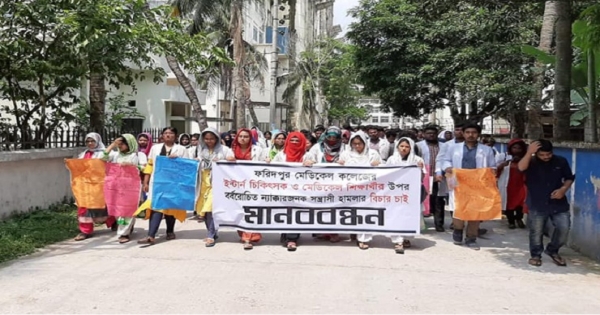 ফরিদপুর মেডিকেল কলেজের দুই শিক্ষানবিশ চিকিৎসক ও এক ছাত্রকে মারপিটের ঘটনার বিচার ও নিরাপত্তার দাবি করে মানববন্ধন ও বিক্ষোভ মিছিল করেছেন শিক্ষার্থীরা।