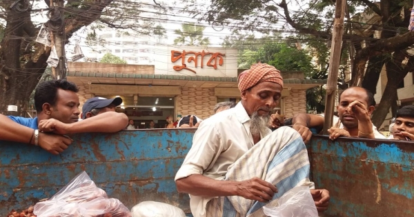 পঞ্চাশোর্ধ এই মানুষটি পুরানো রমনা থানার ফটকের সামনে টিসিবির ট্রাকের উপরে বসে লাইনে দাঁড়ানো নারী-পুরুষের হাতে পেঁয়াজ তুলে দেন। কিন্তু লম্বা লাইনে দাঁড়ানো মানুষের চাপ সামাল দিতে গিয়ে তার দম বন্ধ হওয়ার অবস্থা।