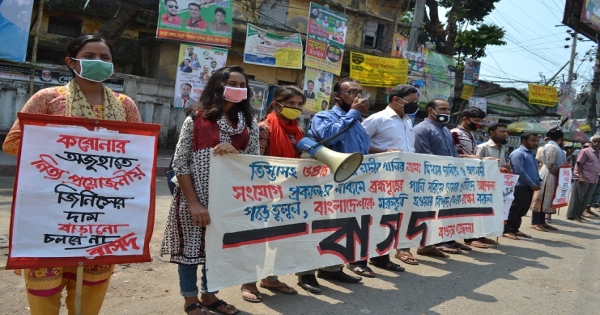 ‘করোনার অজুহাতে নিত্য প্রয়োজনীয় জিনিসের দাম বাড়ানো চলবে না, তিস্তাসহ ৫৪টি অভিন্ন নদীর পানির ন্যায্য হিস্যার দাবিতে ও আন্তঃনদী সংযোগ প্রকল্পের মাধ্যমে ব্রহ্মপুত্রের পানি সরিয়ে নেওয়ার প্রতিবাদে আন্দোলন গড়ে তুলুন, বাংলাদেশকে মরুভূমি হওয়ার বিপদ থেকে রক্ষা করুন’ লেখা সংবলিত ব্যানার এবং প্ল্যাকার্ড হাতে মানববন্ধন করেছে বাসদ বগুড়া জেলা শাখা। শনিবার বেলা সাড়ে ১১টায় শহরের সাতমাথায় এই মানববন্ধন হয়।