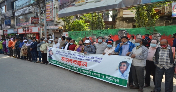 জাতির পিতা বঙ্গবন্ধু শেখ মুজিবুর রহমানের ভাস্কর্য নিয়ে কটূক্তিকারীদের শাস্তির দাবিতে রাজশাহীতে মানববন্ধন অনুষ্ঠিত হয়েছে। মঙ্গলবার সকালে মহানগরীর সাহেববাজার জিরোপয়েন্টে এই মানববন্ধন অনুষ্ঠিত হয়। একাত্তরের ঘাতক দালাল নির্মূল কমিটির রাজশাহী জেলা ও মহানগর শাখা এর আয়োজন করে।