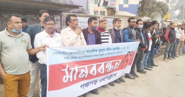 ঘণ্টাব্যাপী মানববন্ধনে পঞ্চগড় প্রেসক্লাবের সভাপতি সফিকুল আলম, সাধারণ সম্পাদক সাইফুল ইসলাম বাবু, সিনিয়ার সাংবাদিক দেশ রূপান্তরের শহীদুল ইসলাম শহীদ, চ্যানেল ২৪ এর হোসেন রায়হান, এনটিভি ও ইত্তেফাকের সাজ্জাদুর রহমান সাজ্জাদ, বাংলাভিশনের মোশাররফ হোসেন, এশিয়ান টিভির আক্তারুজ্জামান আক্তার, বোদা প্রেসক্লাবের সভাপতি নজরুল ইসলাম, সাধারণ সম্পাদক রাশেদুজ্জামান বাবু, তেঁতুলিয়া প্রেসক্লাবের পক্ষে আশরাফুল ইসলাম, আটোয়ারি প্রেসক্লাবের পক্ষে জিল্লুর রহমান প্রমুখ বক্তব্য দেন।