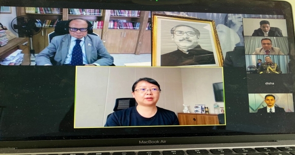 চীনে বাংলাদেশ দূতাবাসের মিনিস্টার ড. এম নজরুল ইসলামের সঞ্চালনায় আলোচনায় মূল বক্তব্য দেন বিশিষ্ট ইতিহাসবিদ, বর্তমান বঙ্গবন্ধু চেয়ার, বাংলা একাডেমির প্রাক্তন মহাপরিচালক এবং বাংলাদেশ ইউনিভার্সিটি অব প্রফেশনাল এর অধ্যাপক ড. সৈয়দ আনোয়ার হোসেন।