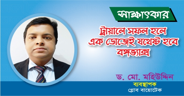 বৈশ্বিক মহামারী করোনাভাইরাসের প্রতিষেধক টিকা উদ্ভাবনের দৌড়ে থাকা দেশীয় প্রতিষ্ঠান গ্লোব বায়োটেক তাদের উদ্ভাবিত টিকা বঙ্গভ্যাক্স ক্লিনিক্যাল ট্রায়ালের অনুমোদনের অপেক্ষায় আছে। ট্রায়ালে সফল হলে মানবশরীরে এই টিকার এক ডোজই যথেষ্ট বলে দাবি করছেন প্রতিষ্ঠানটিন ব্যবস্থাপক ড. মো. মহিউদ্দিন।