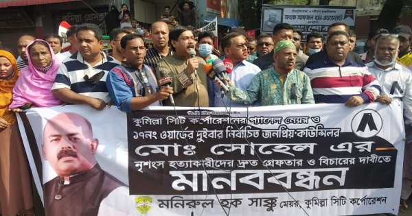 কুমিল্লায় সিটি করপোরেশনের (কুসিক) কাউন্সিলর সোহেলসহ জোড়া খুনের আসামিদের গ্রেপ্তার ও দৃষ্টান্তমূলক শাস্তির দাবিতে মানববন্ধন অনুষ্ঠিত হয়। কুসিক মেয়র মো. মনিরুল হক সাক্কুর নেতৃত্বে বৃহস্পতিবার বেলা ১১টায় কুমিল্লা প্রেসক্লাবের সামনে এ মানববন্ধন হয়। মানববন্ধনে কাউন্সিলর সোহেল হত্যা মামলার আসামিদের দ্রুত গ্রেপ্তার না করা হলে কঠোর কর্মসূচির ঘোষণা দেন মেয়র সাক্কু।