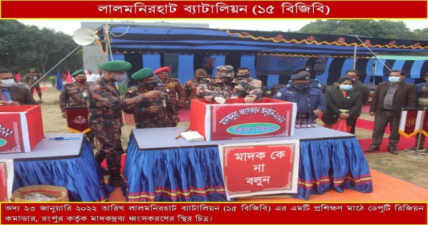 বিজ্ঞপ্তিতে জানানো হয়, লালমনিরহাট বিজিবি-১৫ ব্যাটালিয়ন লালমনিরহাট ও কুড়িগ্রাম জেলার সীমান্ত থেকে ২০২০ সালের ১ ডিসেম্বর থেকে ২০২১ সালের ৩০ নভেম্বর পর্যন্ত মালিকবিহীন জব্দ মাদকদ্রব্য বেলা ১১টার দিকে ব্যাটালিয়ন সদরের প্রশিক্ষণ মাঠে স্বাস্থ্যবিধি অনুসরণ করে সামাজিক দূরত্ব বজায় রেখে সীমিত পরিসরে ধ্বংস করা হয়।