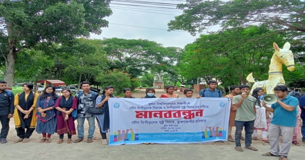 খুলনা বিশ্ববিদ্যালয়ের শিক্ষার্থীর ওপর যৌন নিপীড়নের ঘটনায় মানববন্ধন করেছেন বিশ্ববিদ্যালয়ের সাধারণ শিক্ষার্থীরা। পলাতক আসামিকে গ্রেপ্তার করে দ্রুত বিচারের আওতায় আনতে প্রশাসনের তৎপরতা বাড়ানোর দাবিতে এই মানববন্ধনের আয়োজন করা হয়।