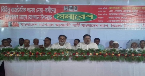 বাংলাদেশ ন্যাপ ডিমলা উপজেলা সমন্বয় কমিটির সদস্য ও প্রবীণ রাজনীতিক আবদুর রহমানের সভাপতিত্বে ও কেন্দ্রীয় সদস্য মোফাক্কারুল ইসলাম পেলবের সঞ্চালনায় প্রধান বক্তা হিসাবে বক্তব্য রাখেন ন্যাপ মহাসচিব এম. গোলাম মোস্তফা ভুইয়া, বিশেষ অতিথি হিসাবে বক্তব্য রাখেন দলের প্রেসিডিয়াম সদস্য ব্যারিষ্টার মশিউর রহমান গানি, বক্তব্য রাখেন দলের প্রবীণ নেতা ওয়াহেদুর রহমান, লুৎফর রহমান, ডোমার উপজেলা বাবু জগবন্ধু রায়, যোগদানকারীদের মধ্যে জাতীয় পার্টি ডিমলা উপজেলা সাবেক সাধারণ সম্পাদক জাকারিয়া হোসেন রাজু, যুগ্ম সম্পাদক আবদুল মতিন, আমজাদ হোসেন লিখন, ডিমলা সদর ইউনিয়ন সভাপতি দুলাল ইসলাম প্রমুখ।
